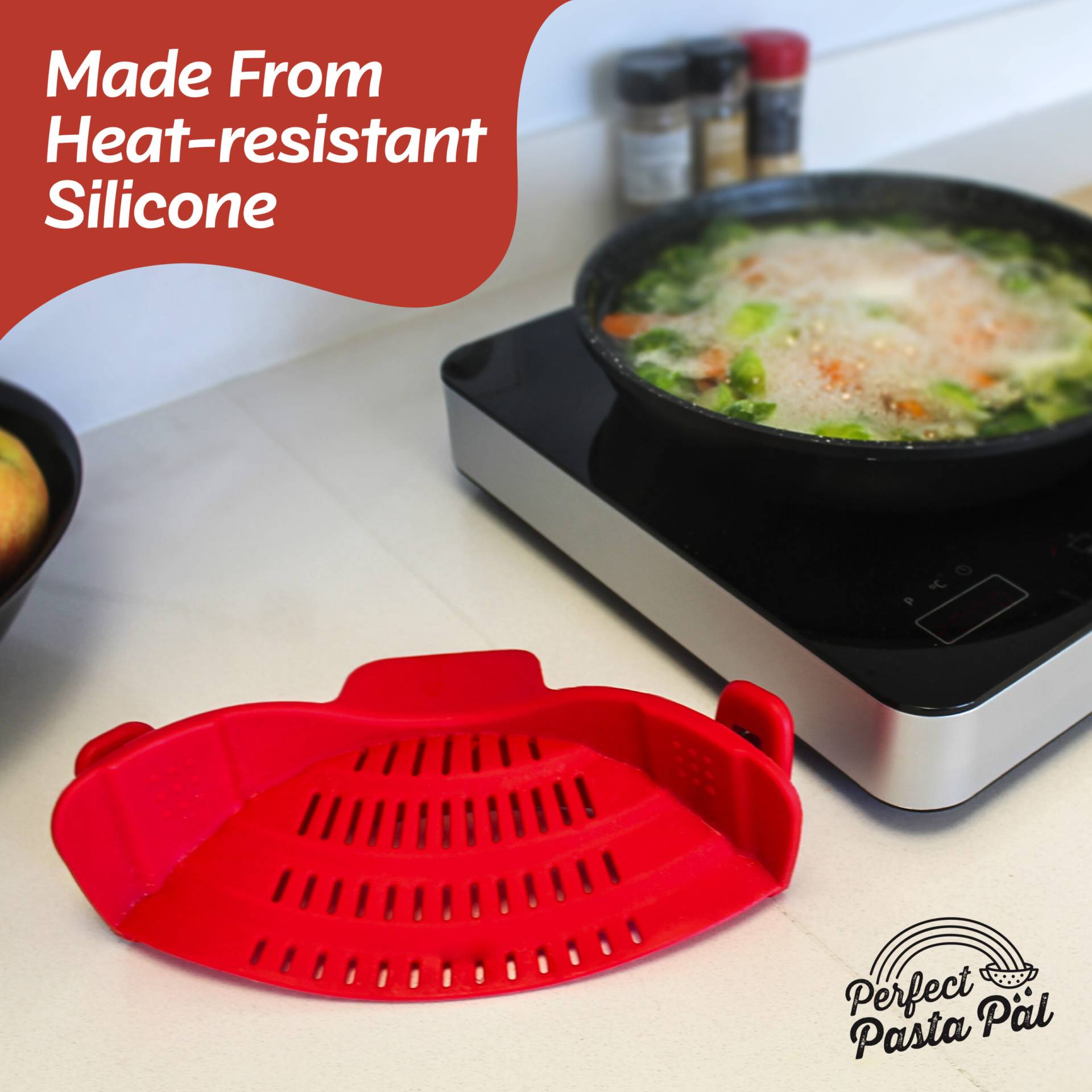 - Made of Heat-Resistant Silicone for Mess-Free Straining: The Perfect Pasta Pal is crafted of food-grade silicone and withstands up to 440°F so you can strain straight from the stove. The heat-resistant silicone will keep its shape without warping or melting.